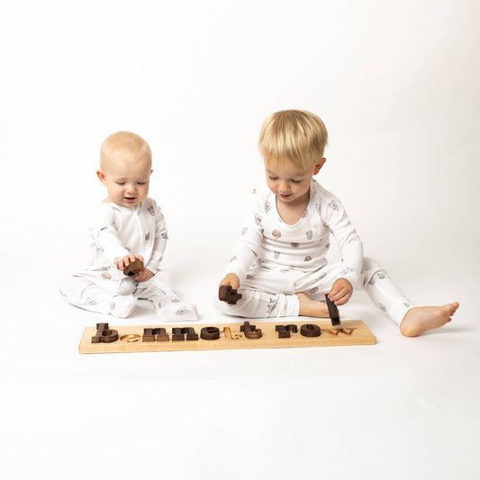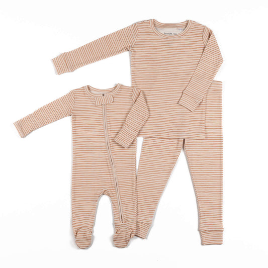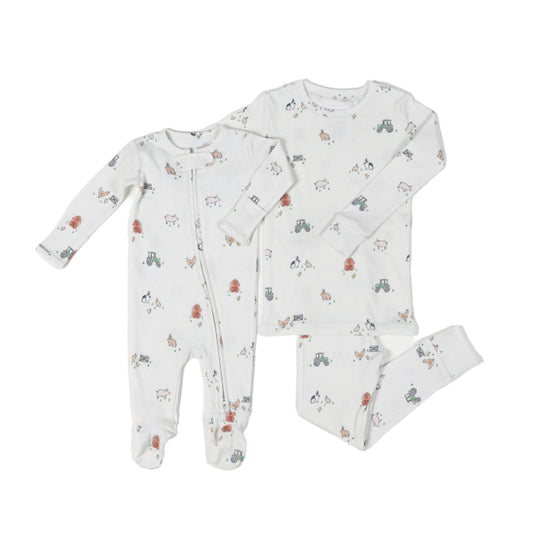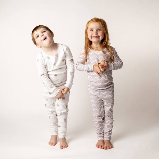 Dark charcoal gray footed sleepers and two-piece long sleeve pajama sets adorned...