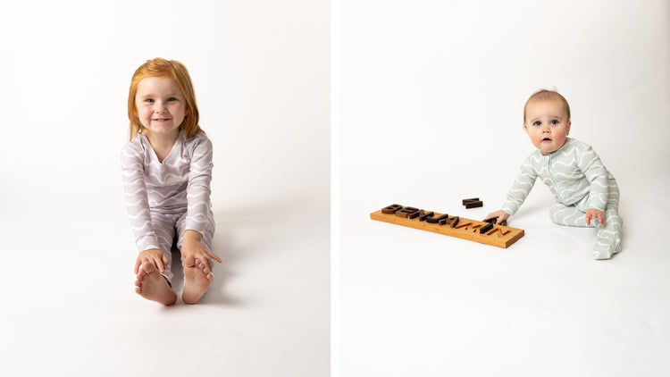 Dark charcoal gray footed sleepers and two-piece long sleeve pajama sets adorned...